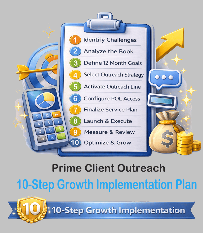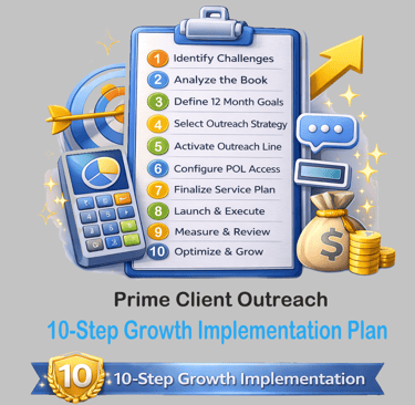 Our 10-step Prime Client Outreach™ process transforms disconnected client books into organized, revenue-producing relationships. By combining strategic analysis, structured outreach, dedicated communication systems, and measurable follow-through, we help agents systematically reconnect with clients, increase Financial Needs Analyses, grow managed assets, and generate referrals — all without overwhelming their daily production responsibilities.